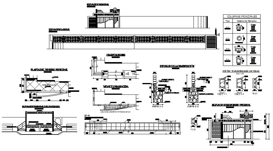 Sports center building elevation, section and construction details that includes a detailed view of flooring view, doors and windows view, staircase view, balcony view, wall design, dimensions, roof or terrace view, foundation plan, structure details, floor construction, beam construction, floor wise structure and constructive details with memory of materials, footings details, staircase construction and sectional details, steps details, dimensions, column view, beam construction and much more of sports center details.