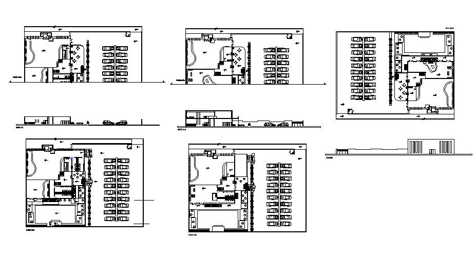 Bowling sports center elevation, section and plan details that includes a detailed view of flooring view, doors and windows view, staircase view, balcony view, wall design, dimensions, roof or terrace view, seating lounge, play area, garden, tree view, sanitary facilities and much more of sports center details.