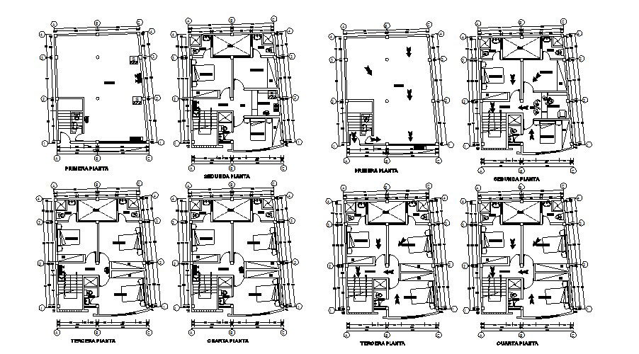 Multi-level hostel villa all floors plan layout details that includes a detailed view of all five floors plan, furniture layout plan details, dimensions details, laundry area, bedroom details, kitchen details and much more of hostel details.
