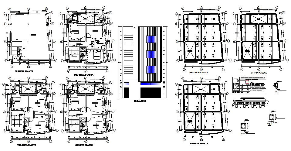 Hostel building multi-level main elevation and floor plan details dwg file