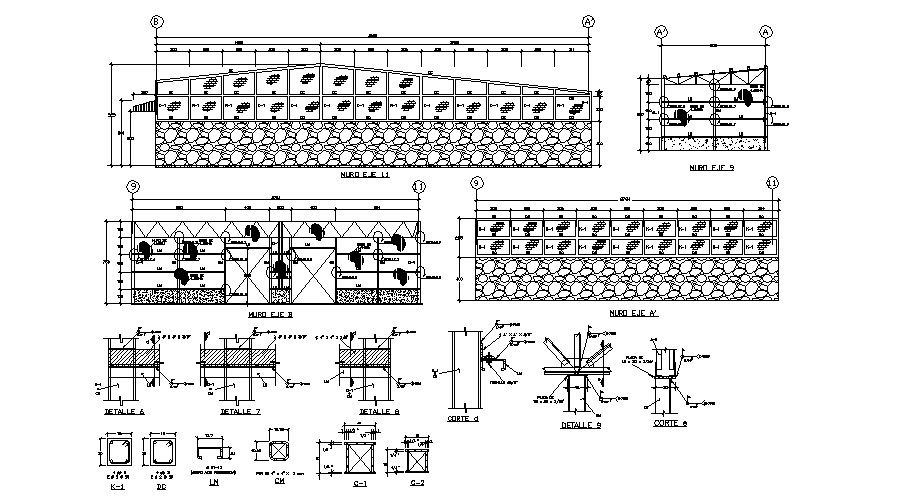 Roof section, structure and constructive details of industrial plant that includes a detailed view of previously linked support, multilayer insulation panel, rubber shock absorber element, galvanized profile for anchorage, acoustic sandwich. (see detail), dimensions details, memory of materials, concrete details, cuts and joints details, reinforcement details, water proofing details and much more of roof structure details.