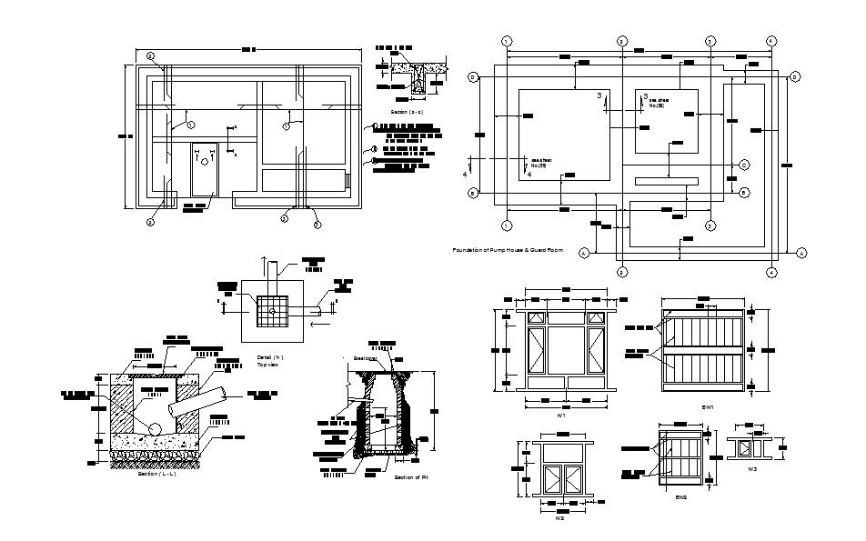 Khurmal pump house foundation plan, section and construction details that includes a detailed view of the foundation, side typical shoe, typical central shoe, columns, foundations, shoes, cistern tank, walls of concr. arm., beams flat, peralted beams, foundation beams, (cement: sand: crushed stone), typical detail of reinforcement and ended of walls of masonry, detail of cistern, cure the concrete by wet way minimum 7 days, - avoid splices and overlaps in areas of maximum effort and much more of house details.
