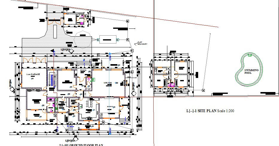 Luxuries villa house distribution plan, site plan and auto-cad details that includes a detailed view of main entry house door, drawing room, living room, family hall, kitchen, dining area, indoor staircases, laundry area, balcony, bedroom, master bedroom, toilets and bathroom, indoor doors, furniture details, swimming pool, lounge, store and much more of house project.