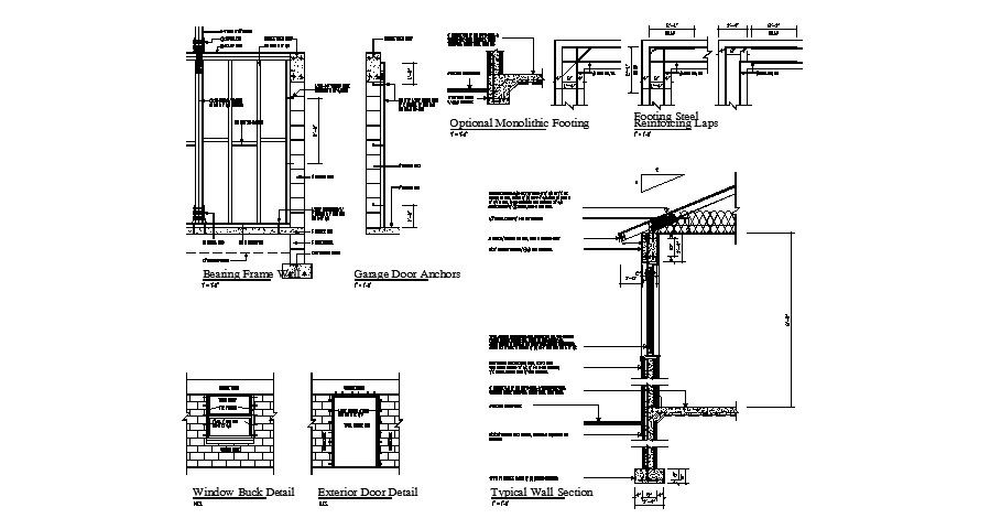 Constructive section and doors and windows installation details of building that includes a detailed view of flooring view, wall construction, memory of materials, footings details, column view, beam construction, covers closure type, soil burried wall closure , exterior solera, holes, interior partition, granite veneer of the country with steel supports, door elevation details, wires and fences, galvanized mesh, clamps galv, aluminum couplings, amarres galv, rh place 1 into the spot and 2 in the corners, pe as reinforcement in straight sections, technical specifications, model selection, symbology details, dimensions details, joints details and much more of structure details.