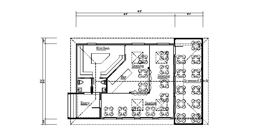 Bar with restaurant distribution plan cad drawing details that includes a detailed view of seating area, entry, kitchen, bar, toilets, dimensions details and much more of bar details.
