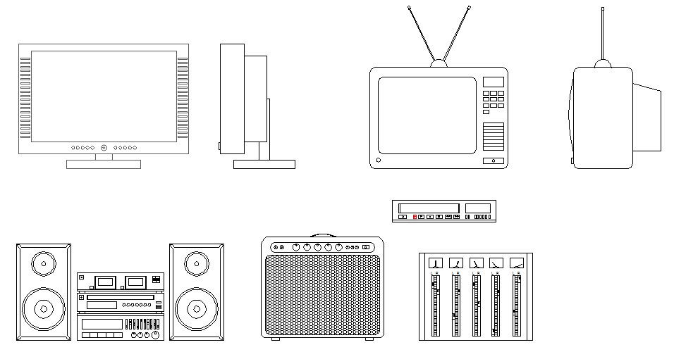 Multiple electric equipment and furniture blocks cad drawing details that includes a detailed view of multiple television blocks, home theater blocks, radio blocks etc with colors details, size details, type details etc for multi purpose uses for cad projects.
