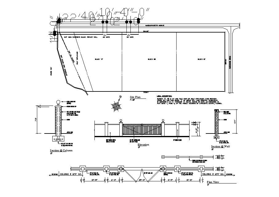 Perimeter fence and gate elevation, section, plan and structure details dwg file