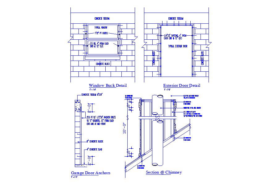 Garage door, window buck, exterior door installation details that includes a detailed view of door elevation, window elevation, welded plate for grappling the clamp, door elevation details, door section details, double swing handle (with placement accessories), reinforcement rib, expanded metal, ceramic block, ceramic, block, lintel 2 irons, wood cap, frame and much more of door and window installation details