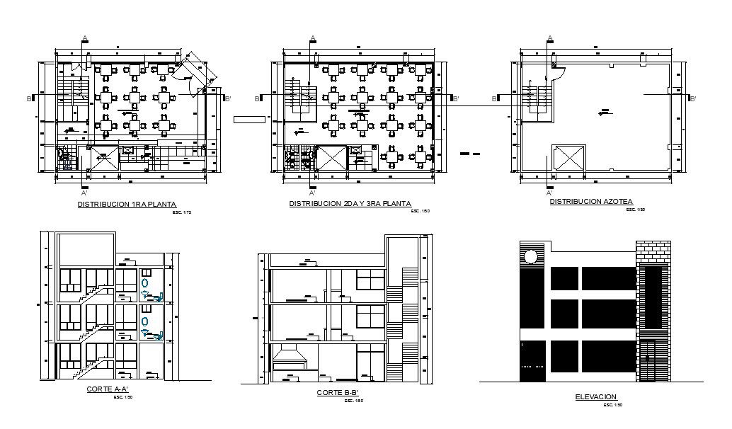 Restaurant main elevation, section and floor plan cad drawing details that includes a detailed view of flooring view, main entry gate, green view, garden cafeteria, tree and plants view, doors and windows view, staircase view, balcony view, wall design, dimensions, roof or terrace view, car parking view with reception area, waiting lounge, dining area, banquaet hall, kitchen, cleaning department, staff room, sanitary facilities, furniture details, interior details and much more of restaurant project.