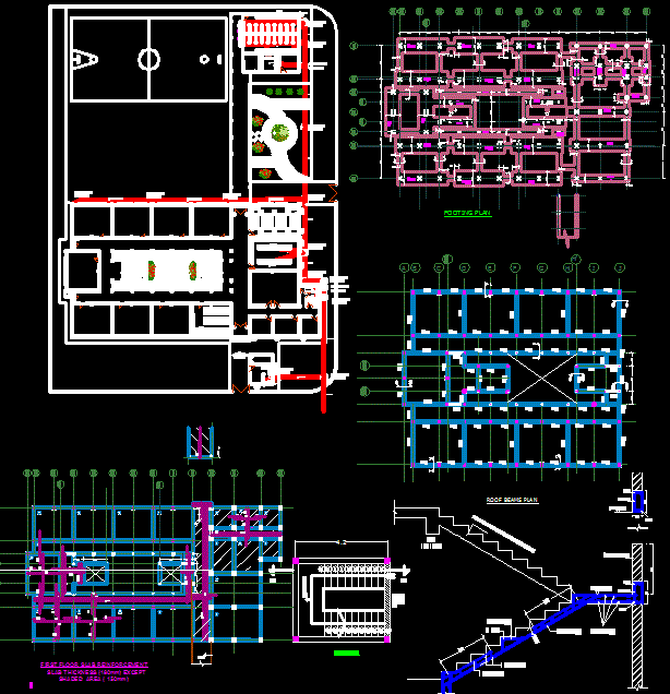 Primary School DWG design includes roof, basement, and section plans with slab reinforcement, column key, and playground layout for architectural projects.