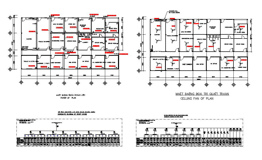 Schematic diagram, ceiling fan and electrical installation details of staff house dwg file