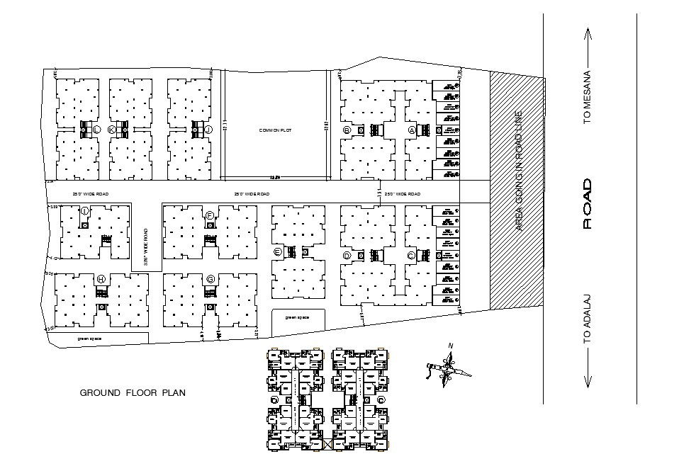 Parking layout plan and ground floor plan details of housing flats building that includes a detailed view of drive way, common plot, wide road, shops, parking space, dimensions details, main entry house door, drawing room, living room, family hall, kitchen, dining area, indoor staircases, laundry area, balcony, bedroom, master bedroom, toilets and bathroom, indoor doors, furniture details and much more of apartment details.