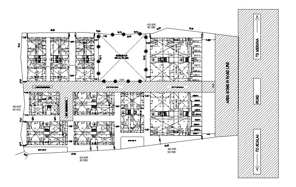 Parking layout plan details of apartment flats Parking layout plan and ground floor plan details of housing flats building that includes a detailed view of drive way, common plot, wide road, shops, parking space, dimensions details, garden details and much more of flats details.