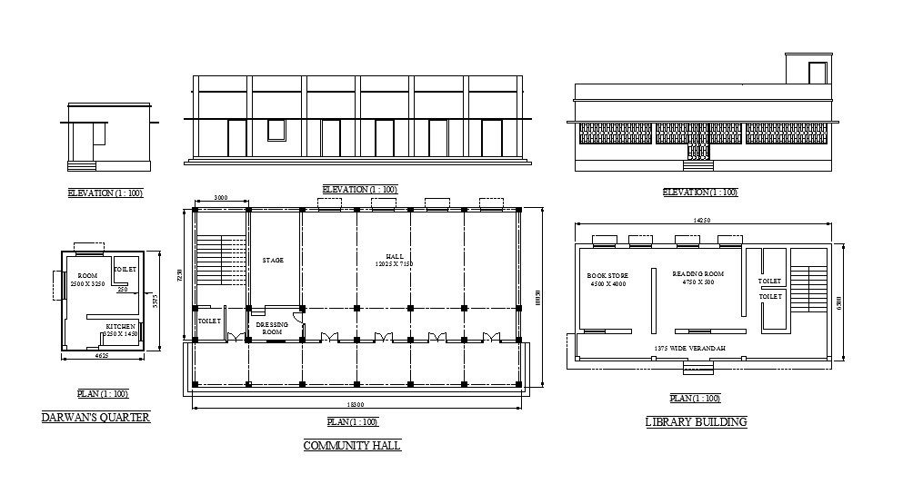 School building elevation, library, community hall and quarter details that includes a detailed view of main and rear elevation details, book store, reading room, dressing room, store, hall, dimensions details, room, toilets, kitchen and much more of school details.