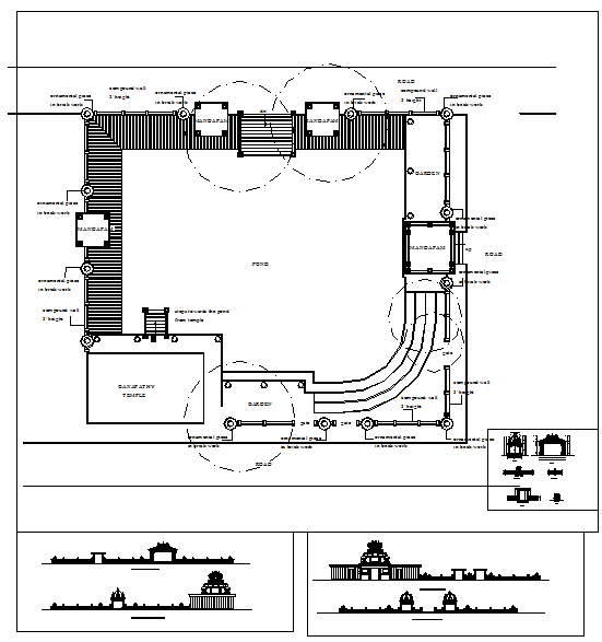 The pilgrim is welcomed through mathematically structured spaces, a network of art, pillars with carvings and statues.Temple Plan & Elevation Download file, Temple Plan & Elevation Detail file.