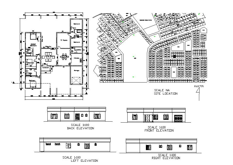 House single story all sided elevation, layout plan and site plan details that includes a detailed view of flooring view, doors and windows view, staircase sectional details, balcony view, wall sections and dimensions details with main entry gate, mini garden, car parking view, main entry house door, drawing room, living room, family hall, kitchen, dining area, indoor staircases, laundry area, balcony, bedroom, master bedroom, toilets and bathroom, indoor doors, furniture details, site plan details and much more of house project.