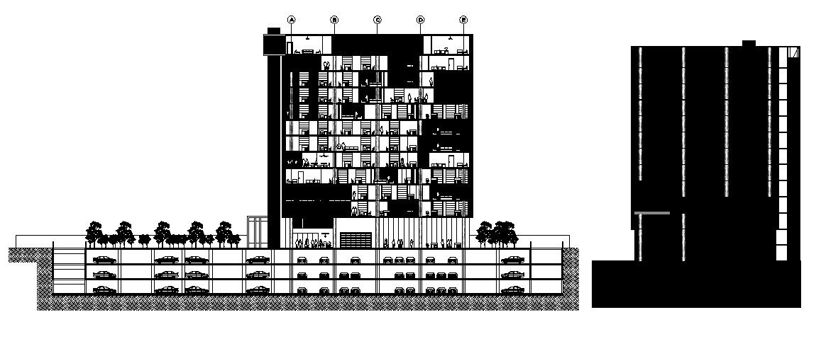 Multi-flooring bank head quarter building main elevation and section details dwg file