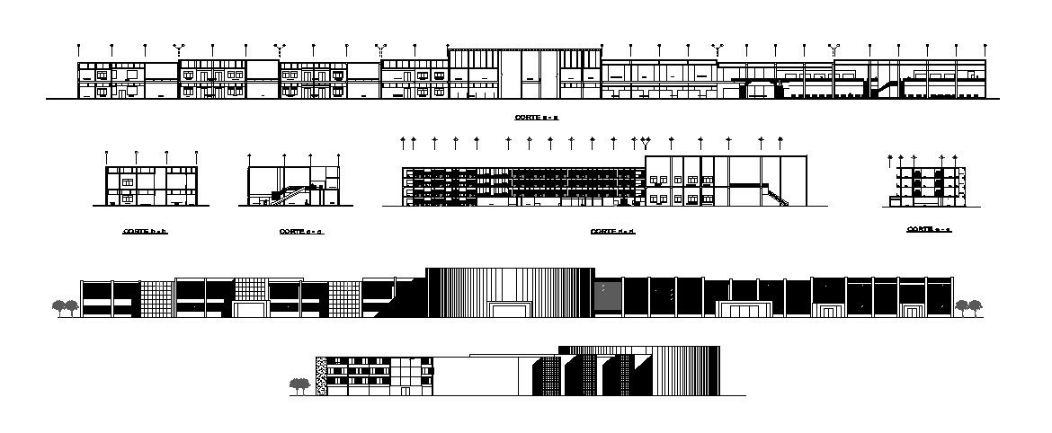 Airport terminal building all sided elevation and section details that includes a detailed view of facade back and side elevations and section details with flooring view, doors and windows view, staircase sectional details, balcony view, wall sections and dimensions details, car parking floor, tree view, wall design and much more of airport details.