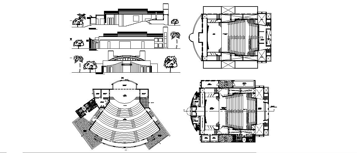 Auditorium hall of college elevation, section and distribution plan details dwg file