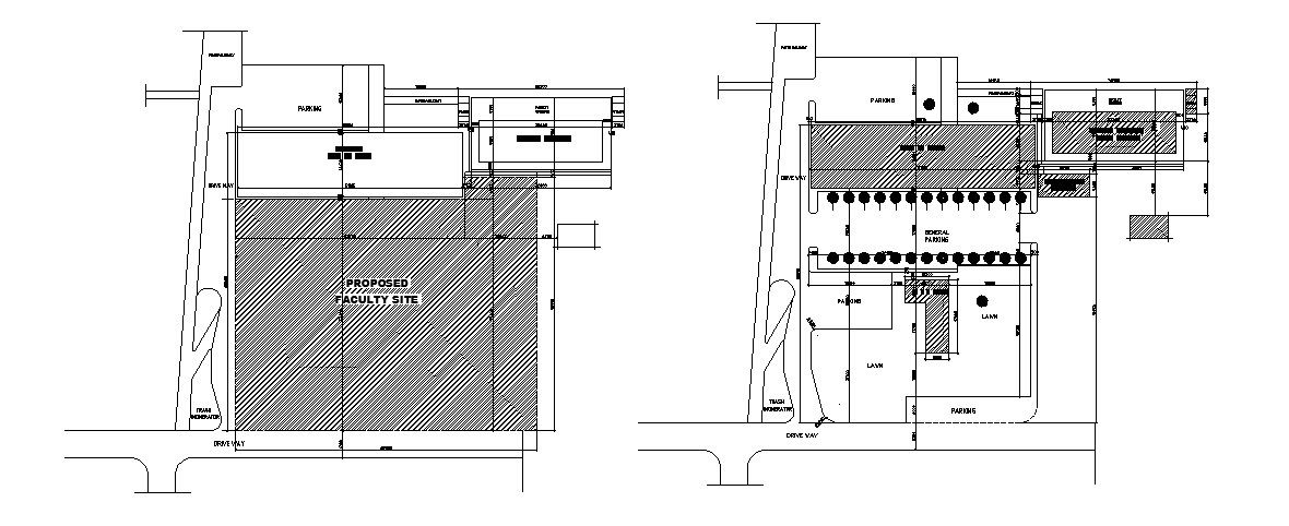 Propose faculty building site plan and landscaping structure details that includes a detailed view of building space details, lawn details, indoor roads details, parking area details, dimensions details, sign board details, garden area details and much more of building site plan details.