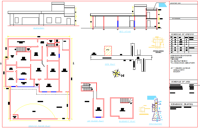 Layout plan, foundation plan, section plan and elevation design of college.College plan DWG Detail file, College plan DWG Download detail.