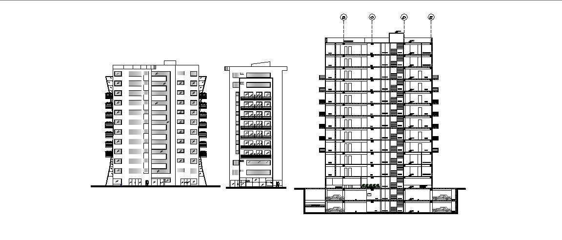 Multi-story mixed used high rise building elevation and section details dwg file