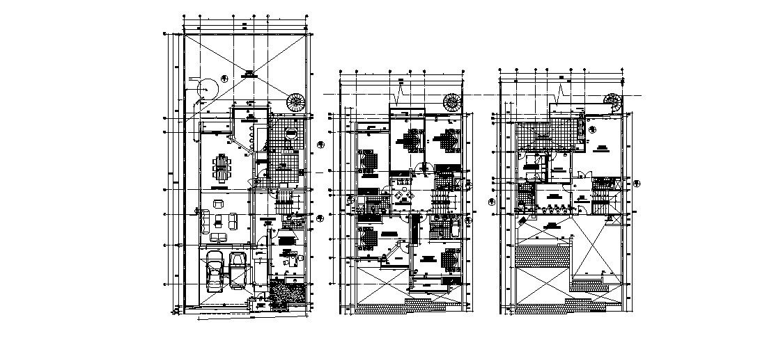 Ground, first and second floor plan details of one family house cad drawing details that includes a detailed view of ground floor, first floor and terrace with main entry gate, mini garden, car parking view, main entry house door, drawing room, living room, family hall, kitchen, dining area, indoor staircases, laundry area, balcony, bedroom, master bedroom, toilets and bathroom, indoor doors, furniture details and much more of house floor plan.