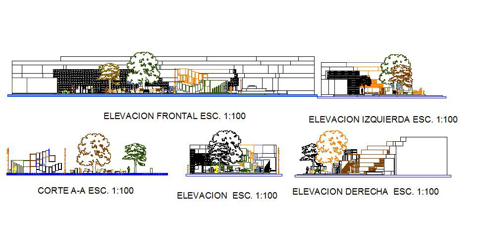 Theme park main gate elevation, section and landscaping details that includes a detailed view of gate and fence details, tree view, shops details, dimensions details, furniture details, ramp walk details, parking details and much more of garden details.