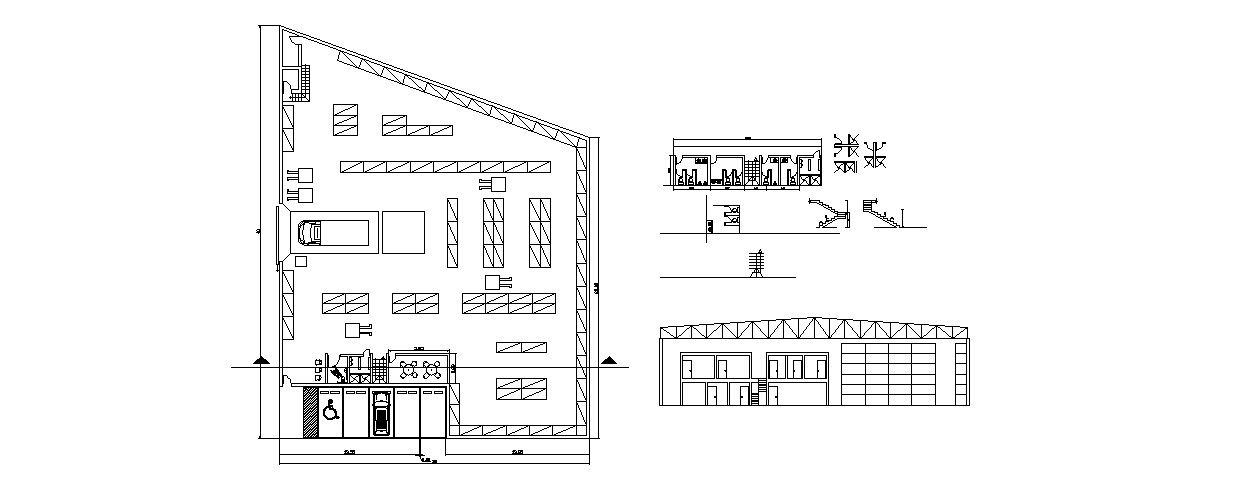 Industrial warehouse plan and sanitary installation for general and handicaps that includes a detailed view of main entry gate, dimensions details, storage space details, that includes a detailed view of toilet sectional details, passage, sanitary equipment installation details, doors and ventilation details, plumbing details, interior details, dimensions details, wall section details and much more of warehouse details.