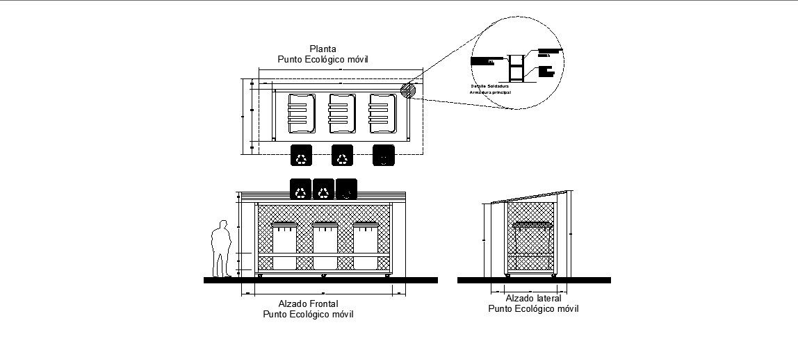Section, plan and constructive structure details of ecological mobile point plant cad drawing details dwg file