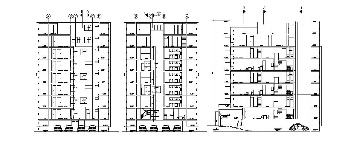 Multi-family residential flats all sided sectional details that includes a detailed view of front and back sectional view, side sectional view, flooring view, doors and windows view, staircase view, balcony view, wall design, dimensions, roof or terrace view, car parking view and much more of sectional details.