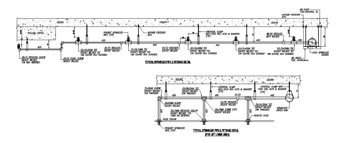 Typical sprinkler pipe and fitting details for lift and lobby cad drawing details dwg file