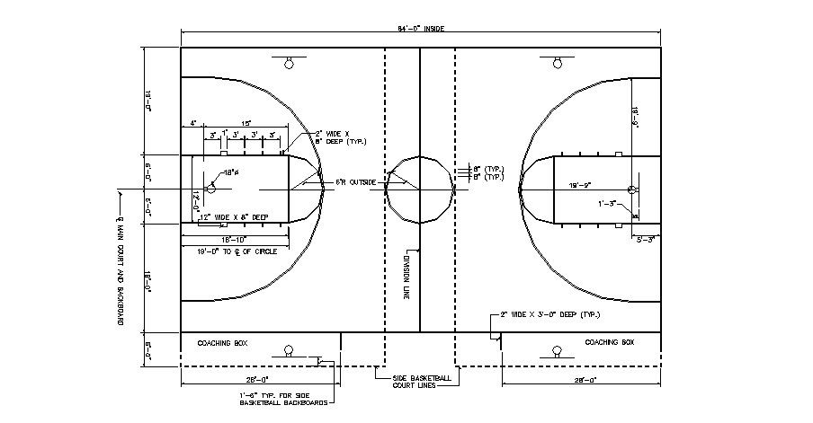 Basket ball court plan cad drawing details that includes a detailed view of coaching box, line details, measure details, dimensions details and much more of court details.