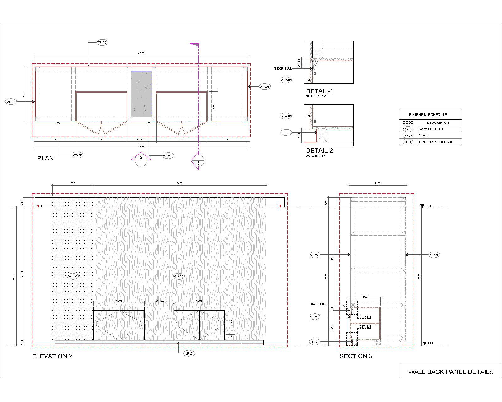 Wall Back Panel plan - sections - elevation and typical details and finishes of veneer and wood type of wood. fixing details for fixing on floor and wall with dimension.