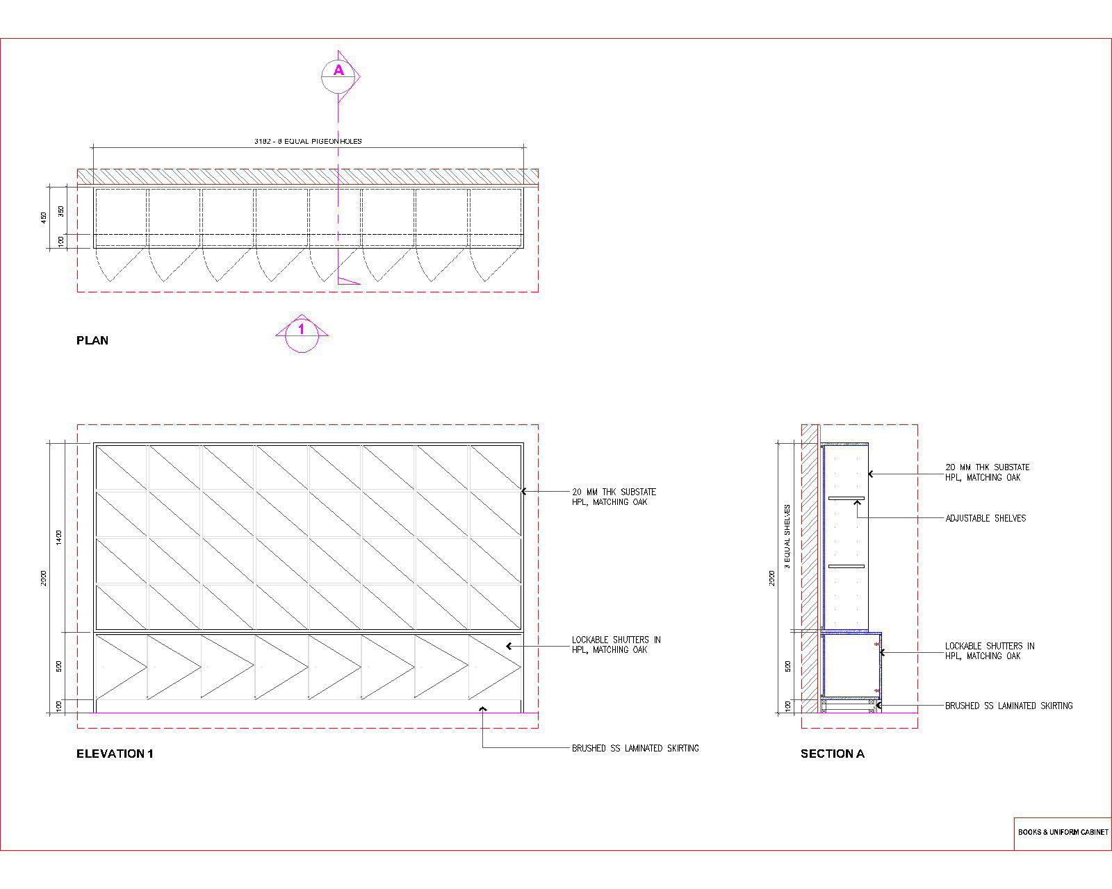 Books and Uniform cabinet plan- sections- elevation and typical details for clear understanding and finishes details.