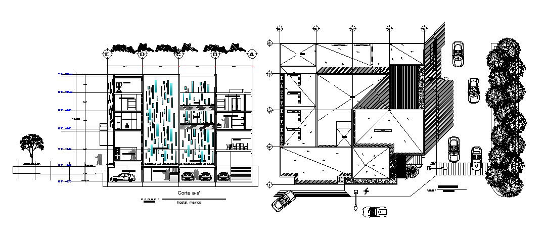 2D drawing of 4 storey hostel with Top view in dwg file which includes details of different storey, details of parking area, details of rooms and kitchen, etc and it also incudes furniture detail in drawing.