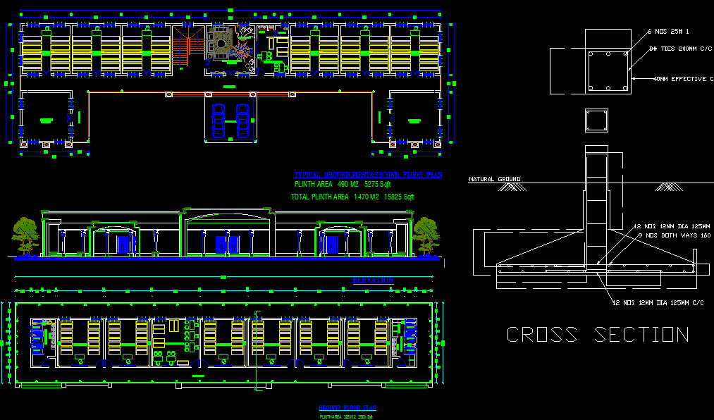 School detailing DWG building design includes elevation, section, and ground floor plans ideal for architects, civil engineers, and construction planners.