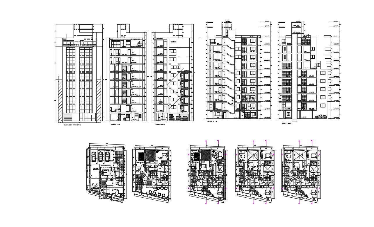 Hotel Building Plan In DWG File which includes detail of different floor and different section, it also provide dimension of Reception area, hall, lobby, waiting room, cafe area, sleeping room, washroom, details of parking area, detail of furniture,