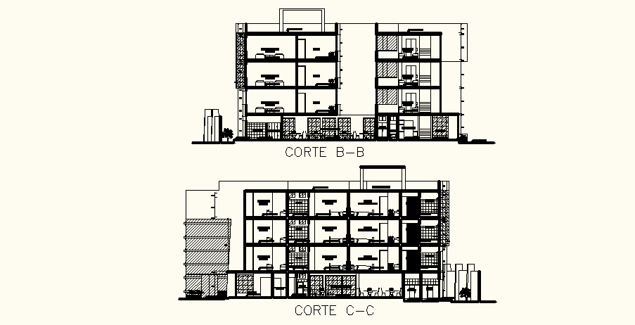 Plan Hotels In DWG File which includes detail of front elevation, back elevation, side elevation, it also gives detail of floor level.