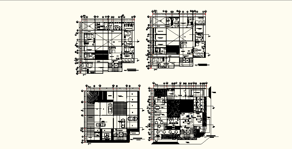 Hotel Plans In DWG File which includes detail of top view, detail dimension of a hall, waiting room, cafe area, rooms, passage, bar, reception area, washroom, toilet, it also gives detail of furniture and parking area.