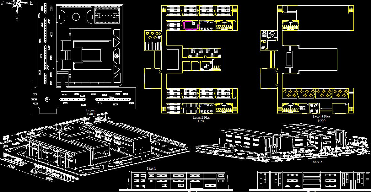 School detailing DWG design includes layout plans of floors 1, 2, and 3 with elevation and 3D views ideal for architects, designers, and civil engineers.