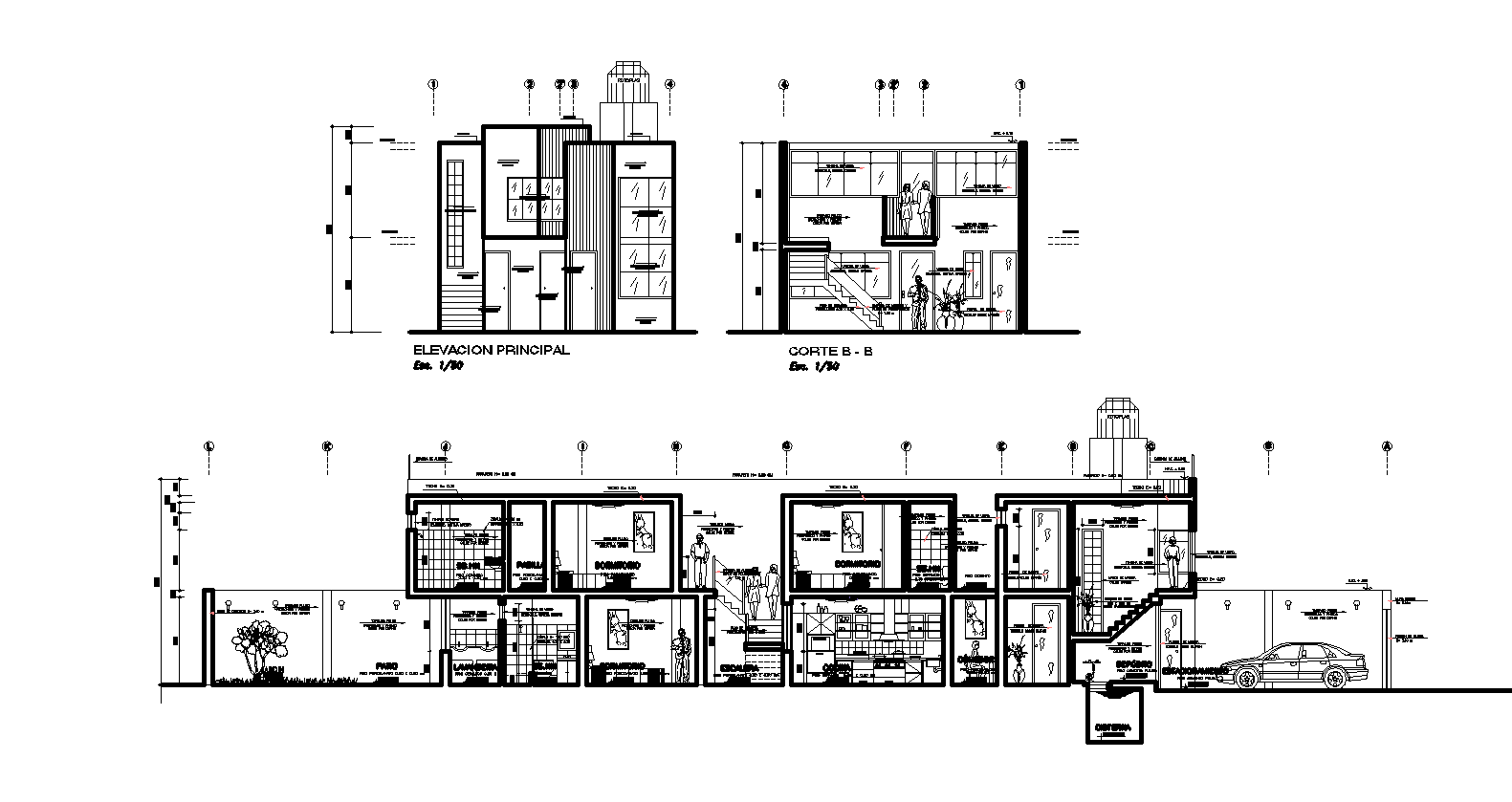 House Plans In AutoCAD File which provide detail of floor level, details of a staircase, doors, window, car parking, garden area, . it also gives the outer design of a house.
