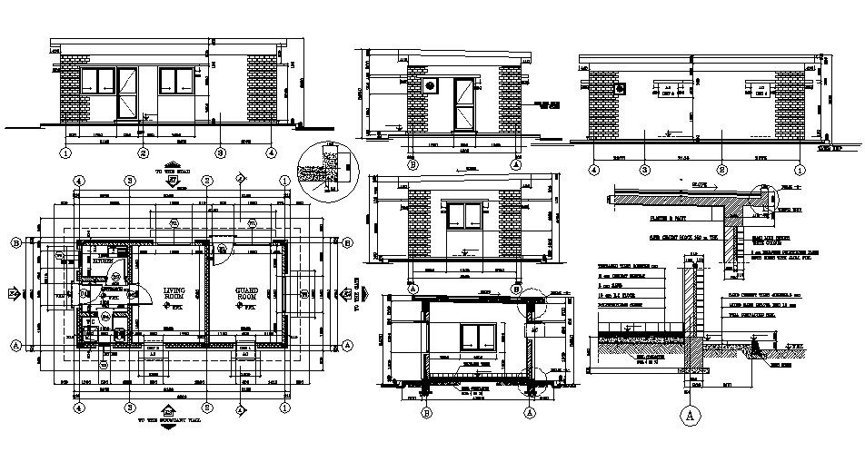Guard Room Design In DWG File which provide detail of the living room, guard room, entrance gate, kitchen, bathroom, toilet, it also gives detail of boundary wall, detail of foundation.