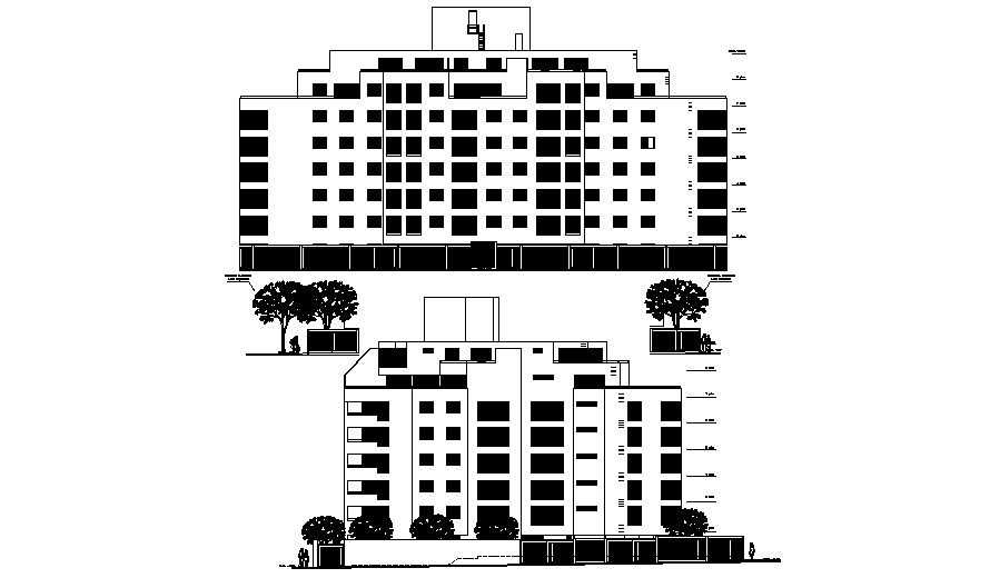 Residential Building In AutoCAD File which provides detail of front elevation, floor level, detail of doors and windows, detail of staircase, detail of lawn area,
