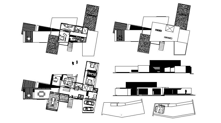 Bungalow Elevation Design In DWG File which includes detail of front elevation, back elevation, side elevation, detail dimension of a hall, bedroom, kitchen, dining room, bathroom, toilet, it also gives detail of furniture, garden area.
