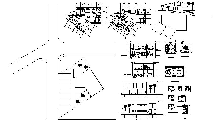 Work Place Building In AutoCAD File which provides detail of front elevation, rear elevation, side elevation, different section, detail dimension of a hall, reception area, cafe area, cabins, kitchen, bathroom, toilet, etc it also gives full detail of furniture.