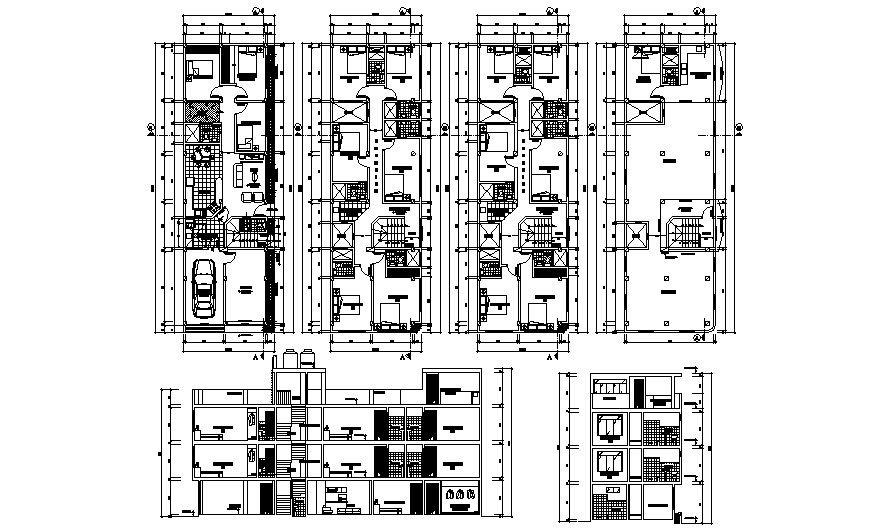 Apartment Plan In AutoCAD File which includes detail of front elevation, side elevation, detail dimension of a hall, bedroom, kitchen, bathroom, toilet,