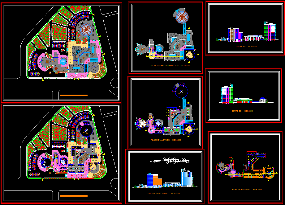 The amazing architectural design of the AutoCAD DWG Drawing Business center building floor plan and the elevation is given in this drawing file. Sectional details are clearly given in this drawing file. Car parking drawing, Garden, and Plantation drawing are added in this drawing DWG file.