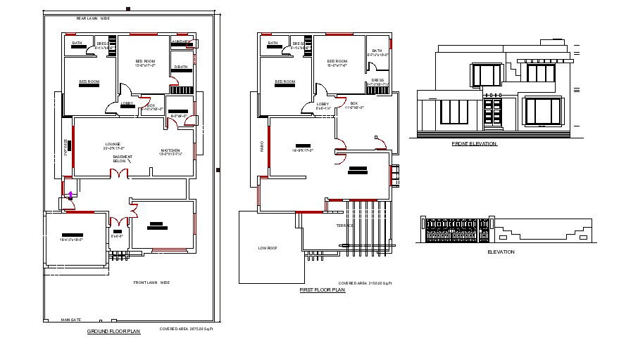 Plan of the house with different elevation in dwg file which provides detail of front elevation, detail dimension of the living room, bedroom, kitchen, dining room, bathroom, toilet, etc it also gives detail of lawn area.