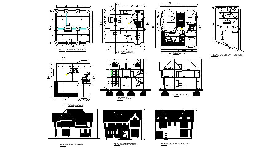 Autocad drawing of residential house 11.40mtr x 11.75mtr with different elevation and section which includes detail of front elevation, side elevation, back elevation, different section, detail dimension of a hall, bedroom, kitchen with dining, bathroom, toilet, etc.